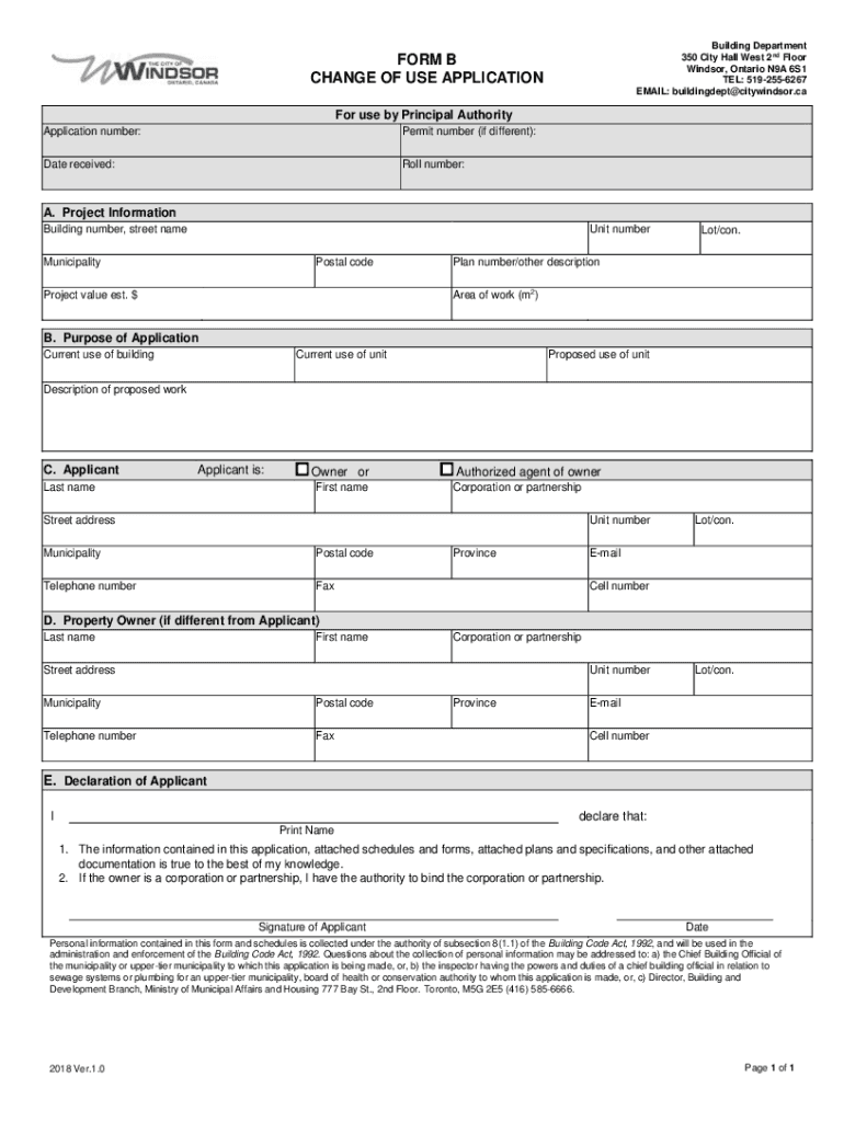 Building Department 350 City Hall West 2nd Floor Windsor, Ontario N9A 6S1 TEL: 5192556267 EMAIL: buildingdept@citywindsor.caFORM B CHANGE OF USE APPLICATION For use by Principal Authority. Application
