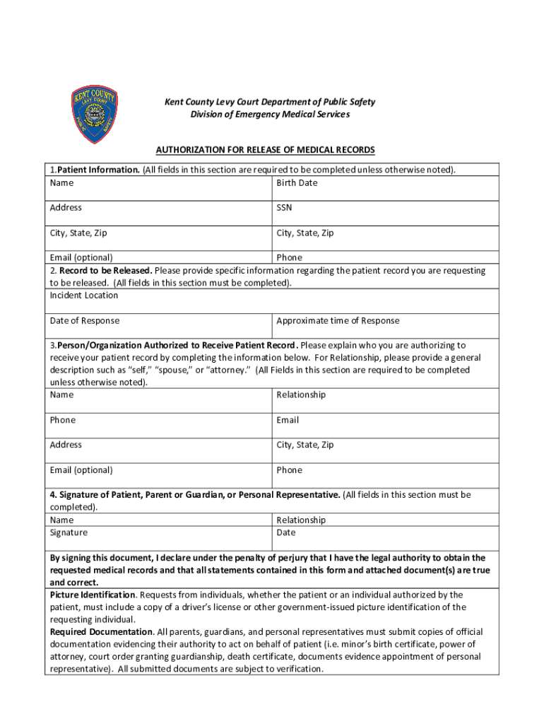 Kent County Levy Court Department of Public Safety Division of Emergency Medical Services AUTHORIZATION FOR RELEASE OF MEDICAL RECORDS 1. Patient Information. (All fields in this section are required