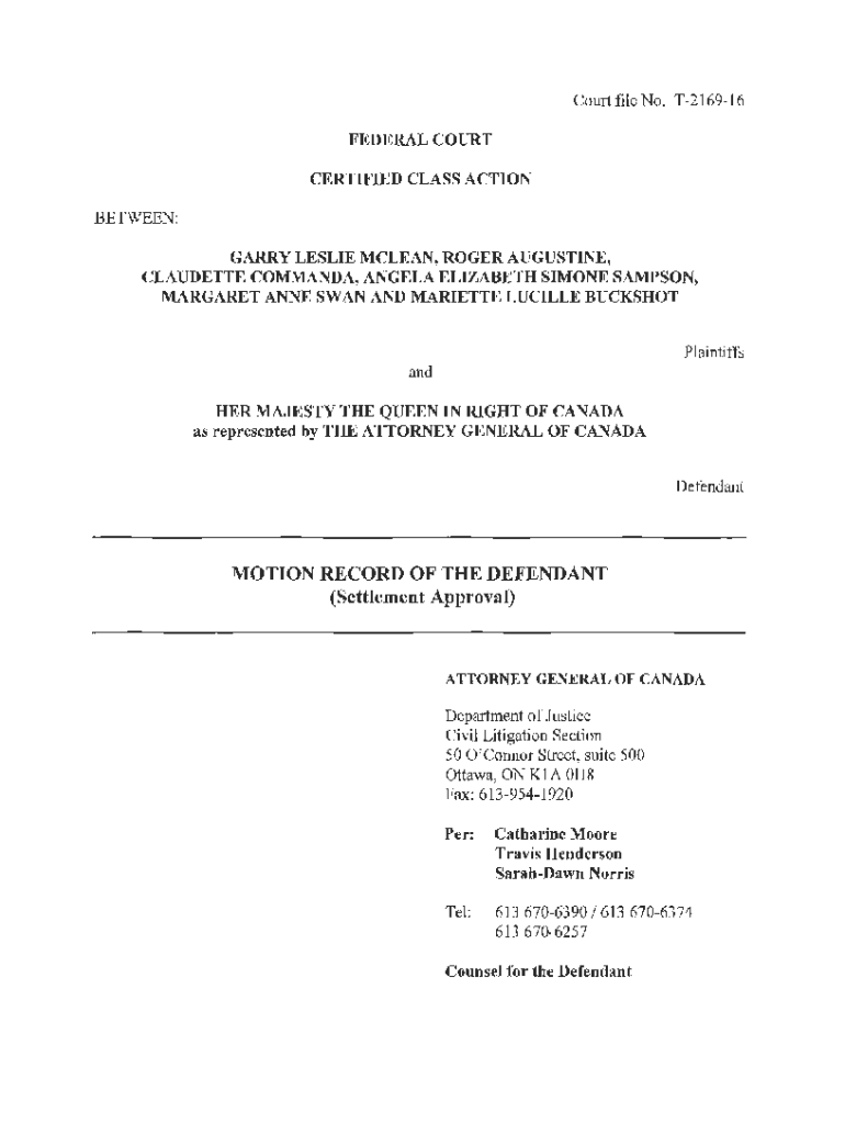 Court file No. T2169 16FEDERAL COURT CERTIFIED CLASS ACTION BETWEEN:GARRY LESLIE McLean, ROGER AUGUSTINE, CLAUDETTE COMMAND, ANGELA ELIZABETH SIMONE SAMPSON, MARGARET ANNE SWAN AND MARIETTA LUCILLE