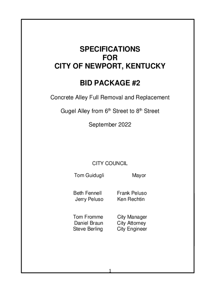 SPECIFICATIONS FOR CITY OF NEWPORT, KENTUCKY BID PACKAGE #2 Concrete Alley Full Removal and Replacement Fuel Alley from 6th Street to 8th Street September 2022CITY COUNCIL Tom GuidugliMayorBeth Fennel