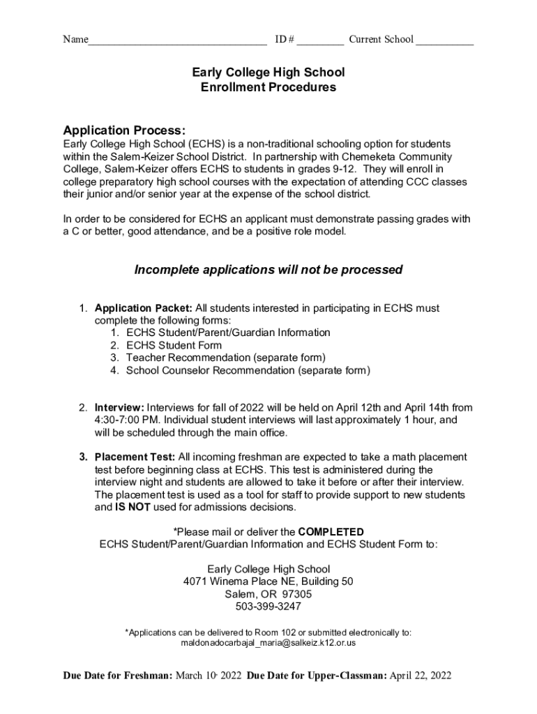 Name___ ID # ___ Current School ___Early College High School Enrollment Procedures Application Process:Early College High School (ECHO) is a nontraditional schooling option for students within the