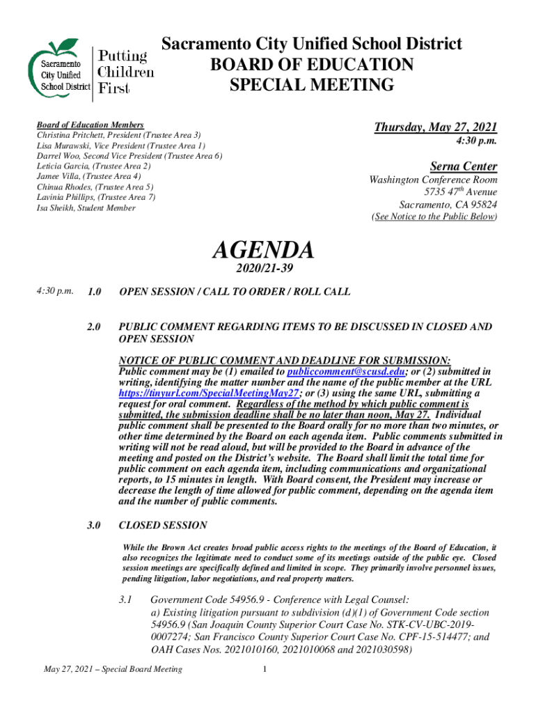 Sacramento City Unified School District BOARD OF EDUCATION SPECIAL MEETING Board of Education Members Christina Pritchett, President (Trustee Area 3) Lisa Murasaki, Vice President (Trustee Area 1)