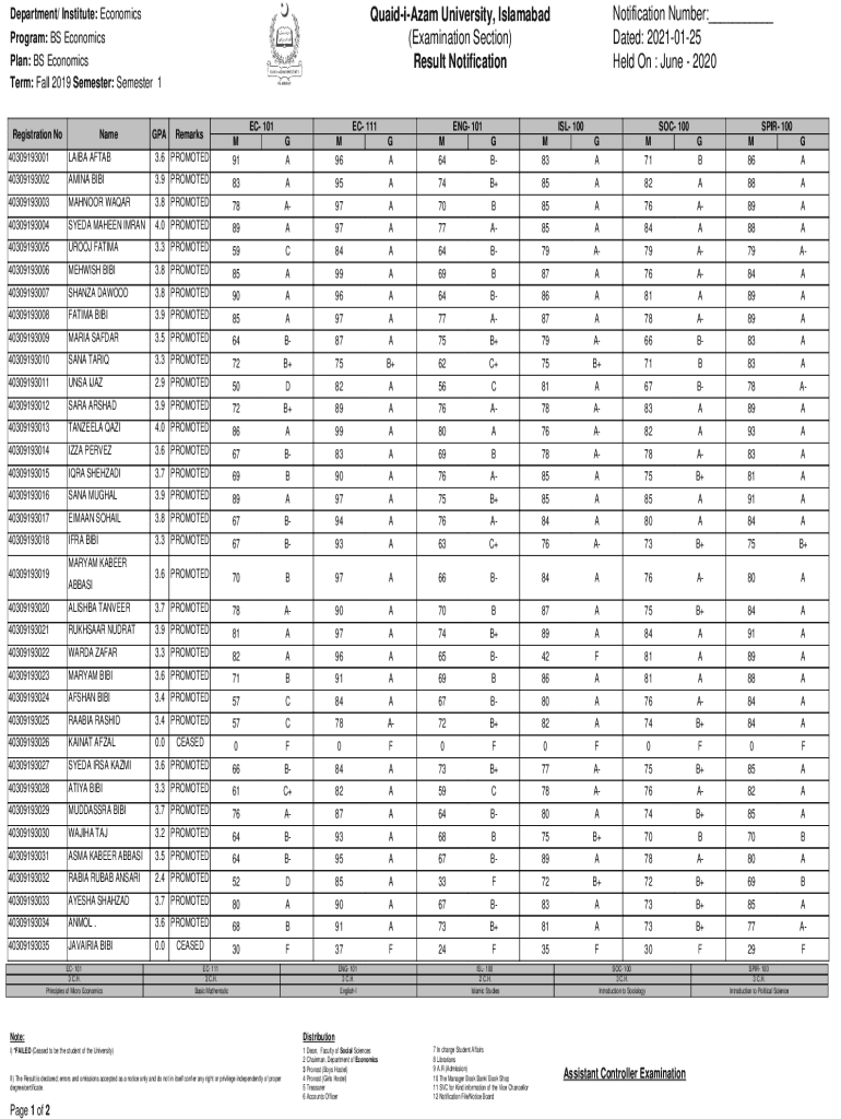Registration NoNameGPANotification Number:___ Dated: 20210125 Held On : June 2020QuaidiAzam University, Islamabad (Examination Section) Result NotificationDepartment/ Institute: Economics Program: