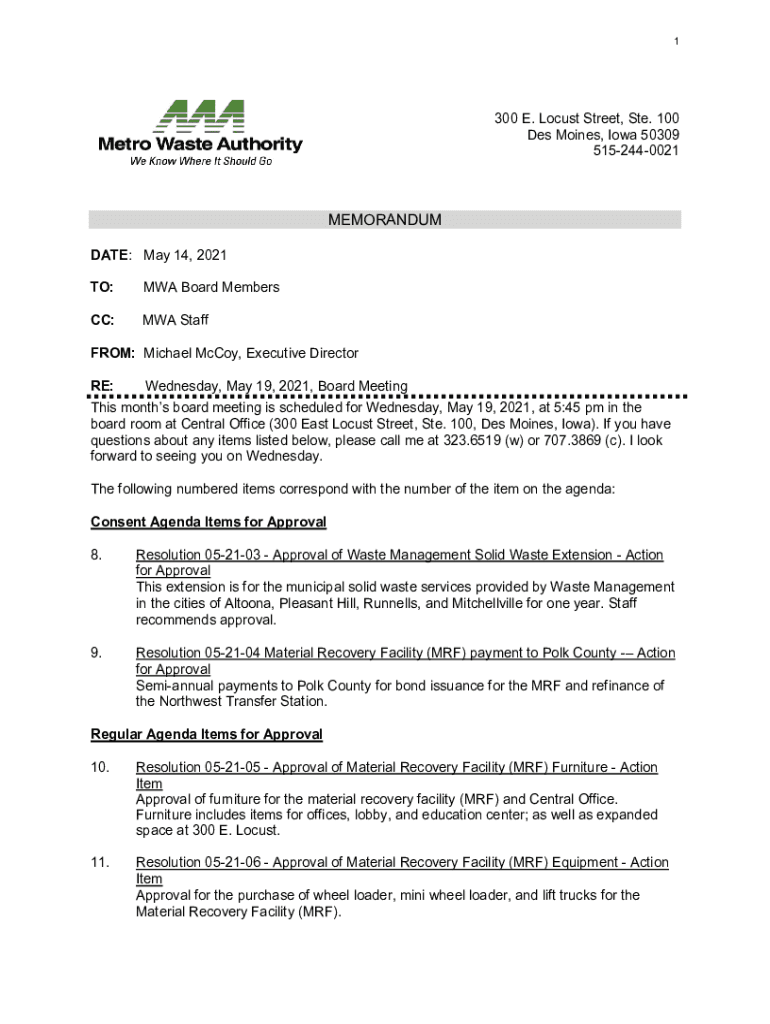 1300 E. Locust Street, Ste. 100 Des Moines, Iowa 50309 5152440021MEMORANDUM DATE: May 14, 2021, TO:MWA Board Members CC:MWA Stafford: Michael McCoy, Executive Director RE: Wednesday, May 19, 2021,