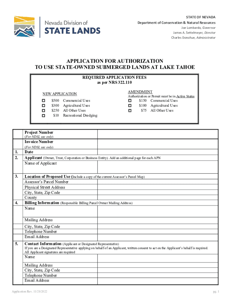STATE OF NEVADA Department of Conservation & Natural Resources Joe Lombardo, Governor James A. Settelmeyer, Director Charles Donahue, AdministratorINSTRUCTIONS AND APPLICATION FOR AUTHORIZATION TO