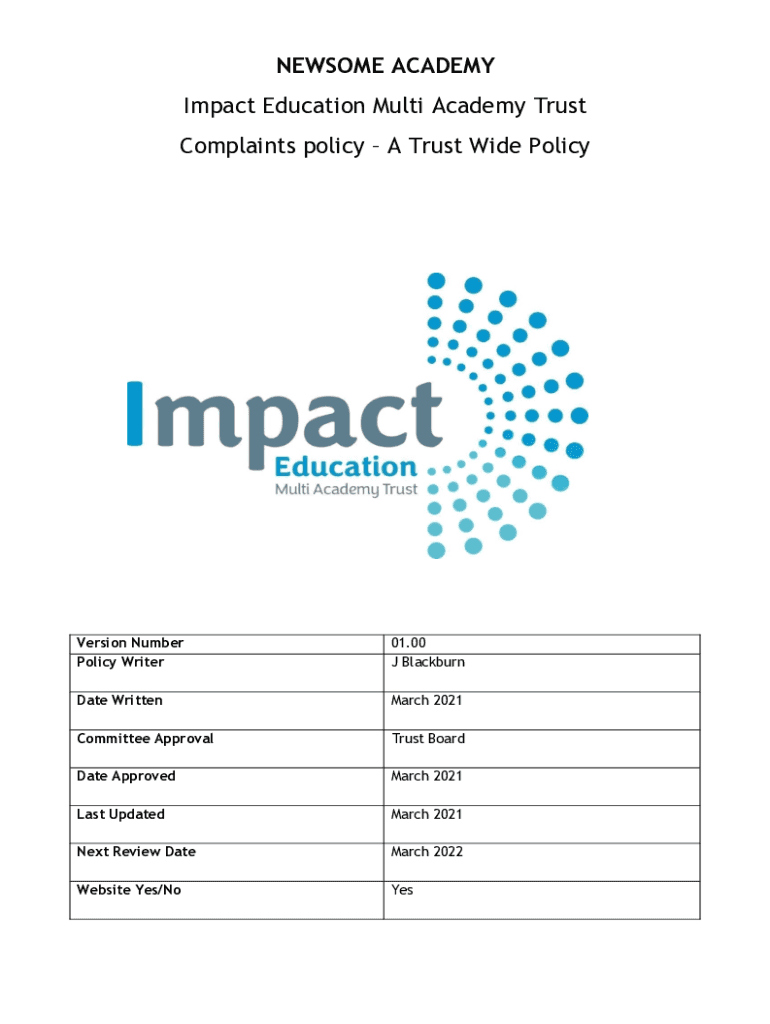 NEWSOME ACADEMY Impact Education Multi Academy Trust Complaints policy A Trust Wide PolicyVersion Number Policy Writer01.00 J BlackburnDate Written March 2021Committee ApprovalTrust Boardwalk Approved