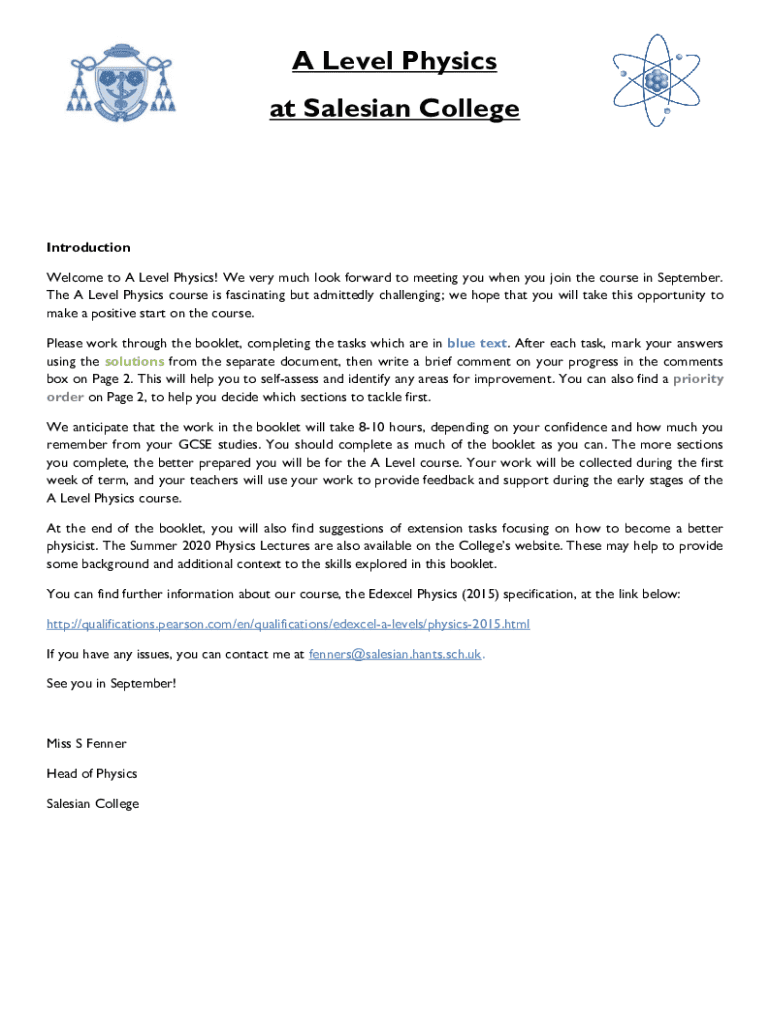 A Level Physics at Salesian CollegeIntroduction Welcome to A Level Physics! We very much look forward to meeting you when you join the course in September. The A Level Physics course is fascinating