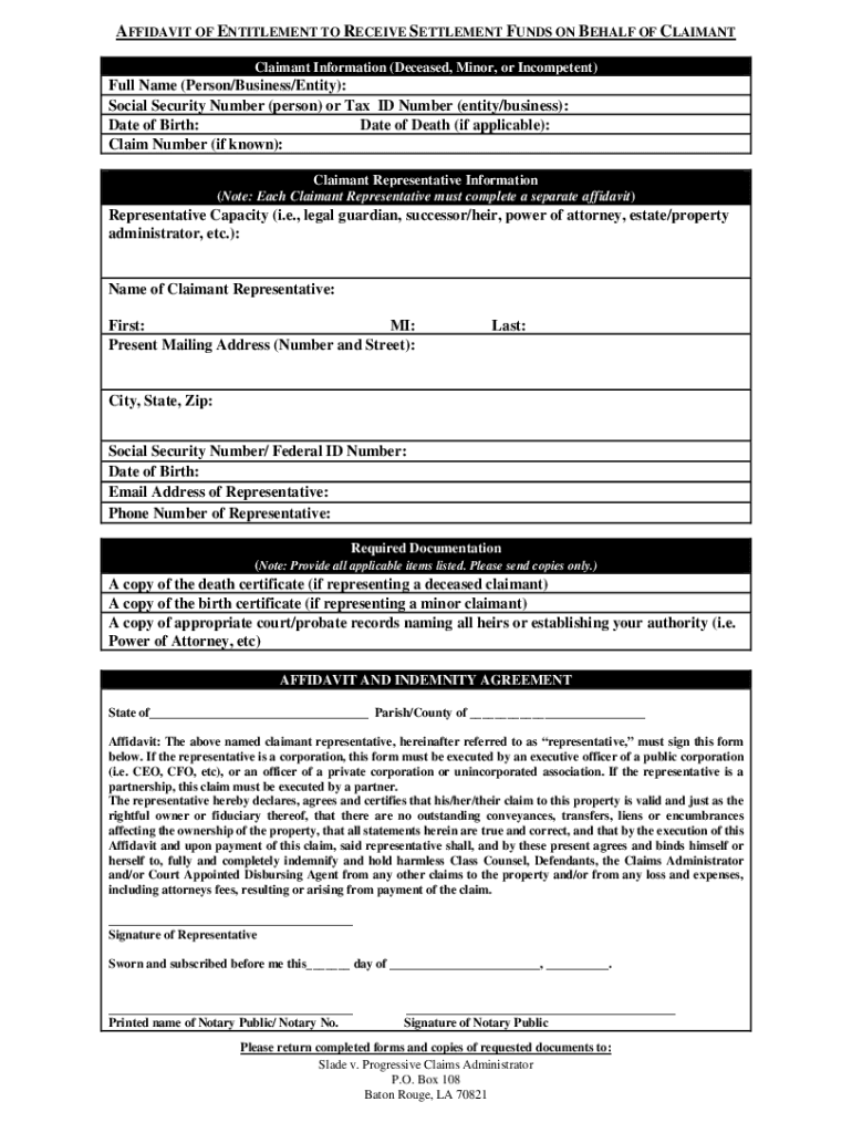 AFFIDAVIT OF ENTITLEMENT TO RECEIVE SETTLEMENT FUNDS ON BEHALF OF CLAIMANT Information (Deceased, Minor, or Incompetent)Full Name (Person/Business/Entity): Social Security Number (person) or Tax ID