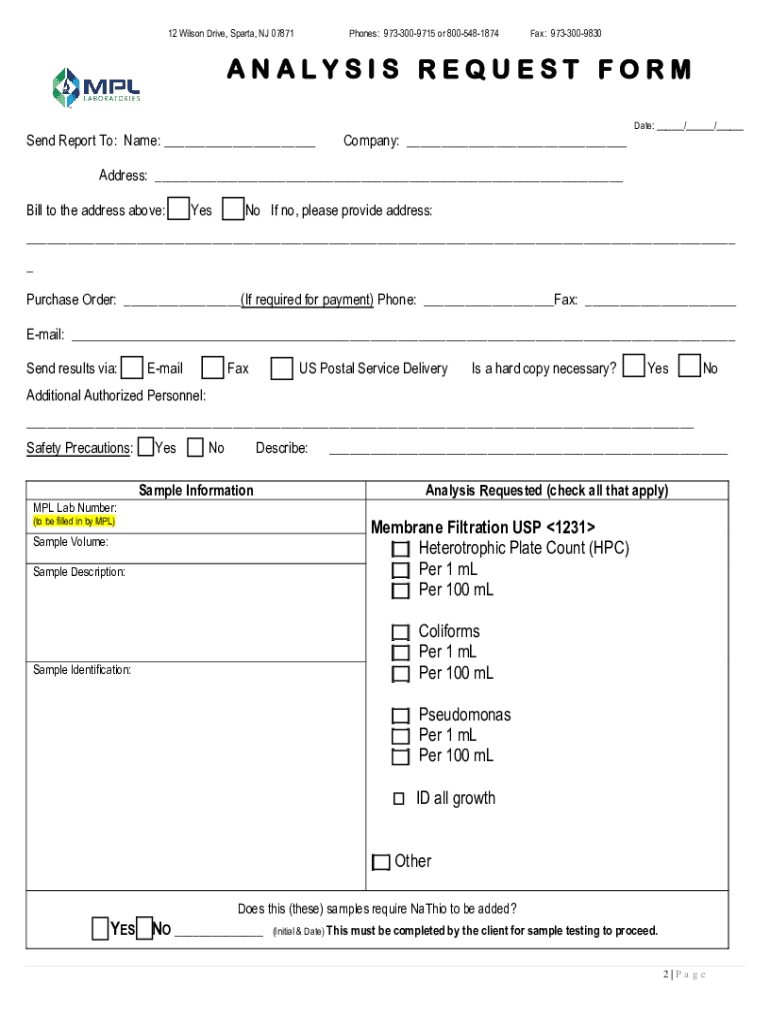 12 Wilson Drive, Sparta, NJ 07871Phones: 9733009715 or 8005481874Fax: 9733009830ANALYSIS REQUEST FORM INSTRUCTIONS: The analysis request form is on page 2 of this document. Please include the following