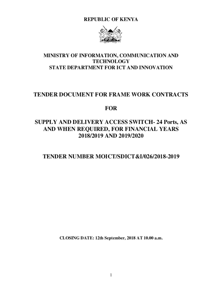REPUBLIC OF KENYAMINISTRY OF INFORMATION, COMMUNICATION AND TECHNOLOGY STATE DEPARTMENT FOR ICT AND INNOVATIONTENDER DOCUMENT FOR FRAME WORK CONTRACTS FOR SUPPLY AND DELIVERY ACCESS SWITCH 24 Ports,
