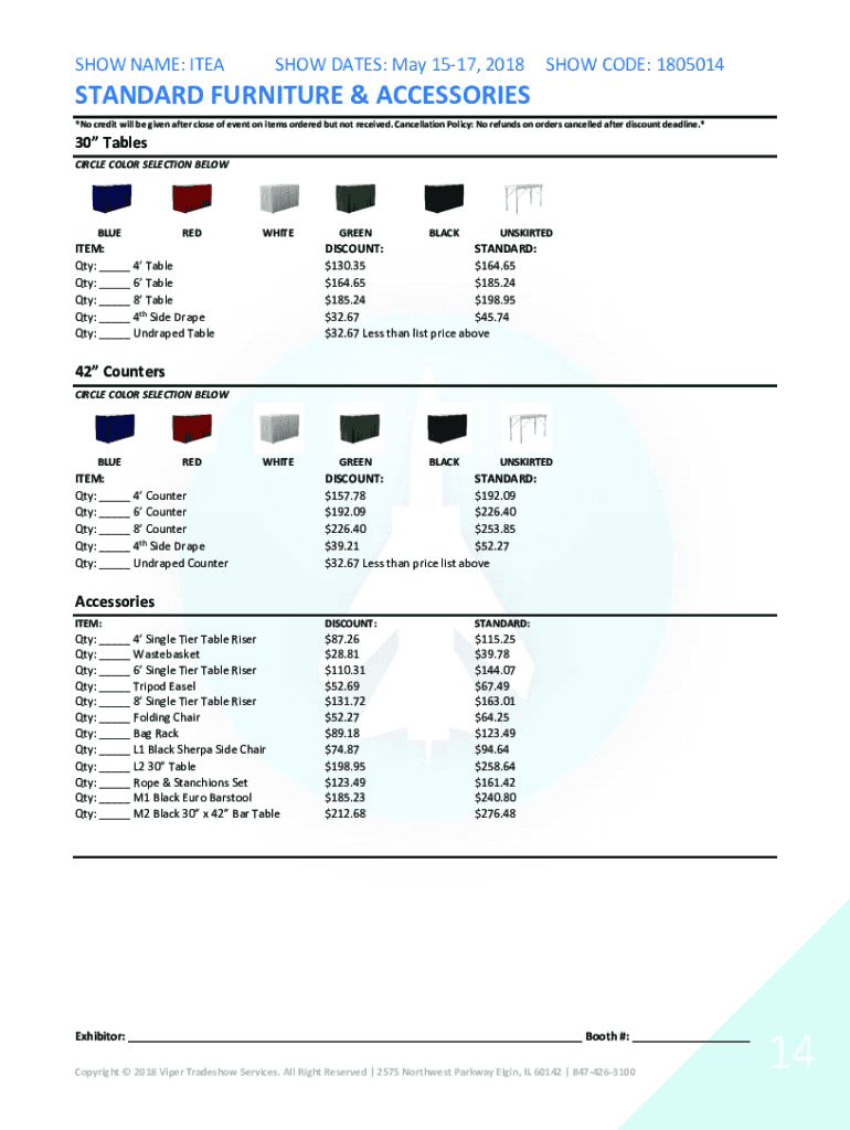 *Nocreditwillbegivenaftercloseofeventonitemsorderedbutnotreceived. CancellationPolicy:Norefundsonorderscancelledafterdiscountdeadline.×30Tables