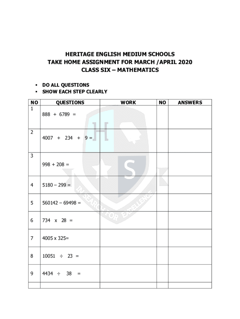 HERITAGE ENGLISH MEDIUM SCHOOLS TAKE HOME ASSIGNMENT FOR MARCH /APRIL 2020 CLASS SIX MATHEMATICS NO 12DO ALL QUESTIONS SHOW EACH STEP CLEARLY QUESTIONS 888 + 6789 4007 + 234 + 9 3 998 + 208 45180