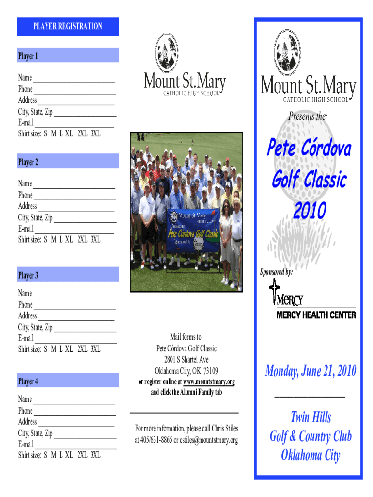 PLAYER REGISTRATION Player 1 Name ___ Phone ___ Address ___ City, State, Zip ___ Email ___ Shirt size: S M L XL 2XL 3XLPresents the:Pete Cordova Golf Classic 2010Player 2 Names ___ Phone ___ Address