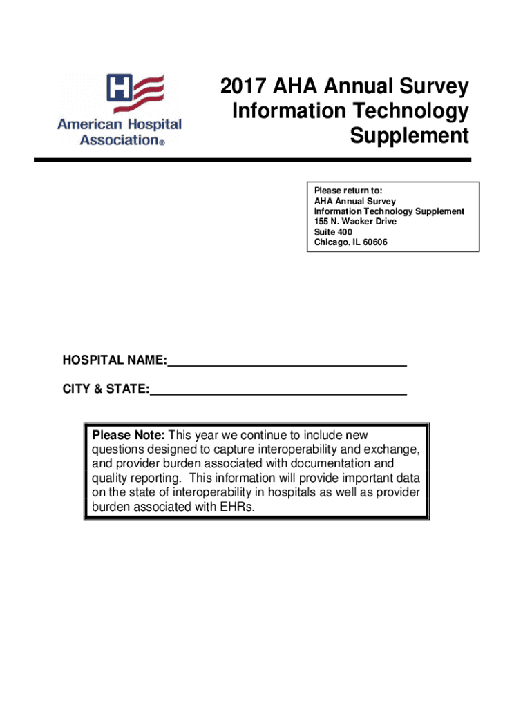 2017 AHA Annual Survey Information Technology Supplement Please return to: AHA Annual Survey Information Technology Supplement 155 N. Wacker Drive Suite 400 Chicago, IL 60606HOSPITAL NAME: CITY &