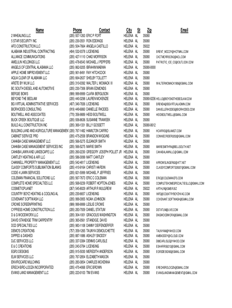 NamePhone2 HEALING LLC (205) 9371263 5-STAR SECURITY INC (205) 2303551 AFD CONSTRUCTION LLC (205) 5047664 ALABAMA INDUSTRIAL CONTRACTING (404) 5320378 ALLIANCE COMMUNICATIONS (205) 4271110 AMERICAN