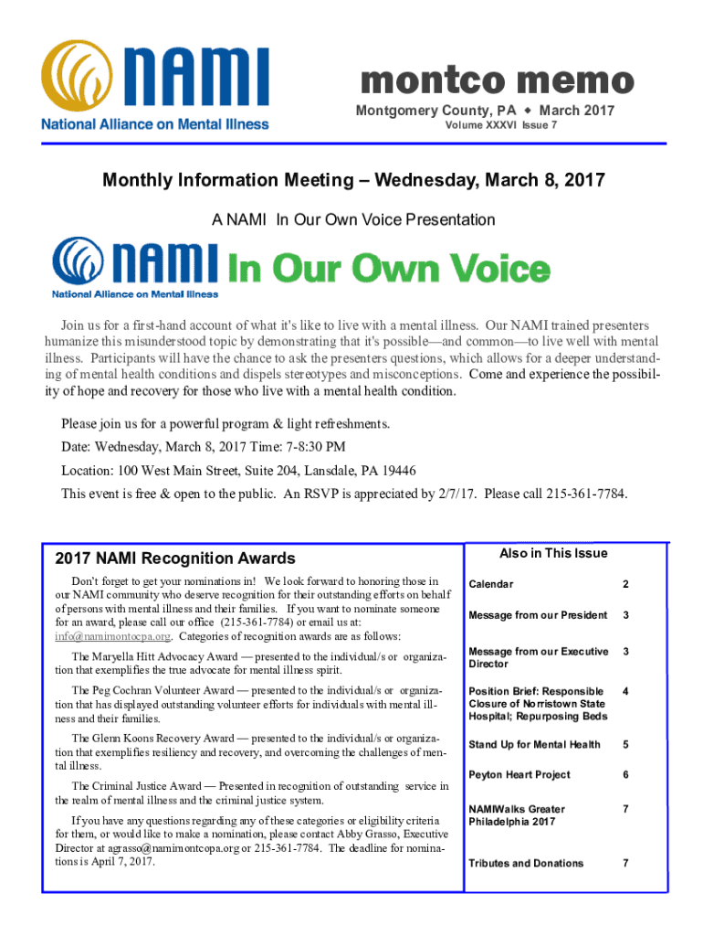 Monaco memo Montgomery County, PA March 2017 Volume XXXVI Issue 7Monthly Information Meeting Wednesday, March 8, 2017, A NAME In Our Own Voice PresentationJoin us for a firsthand account of what it\'s
