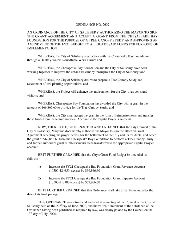 ORDINANCE NO. 2607 AN ORDINANCE OF THE CITY OF SALISBURY AUTHORIZING THE MAYOR TO SIGN THE GRANT AGREEMENT AND ACCEPT A GRANT FROM THE CHESAPEAKE BAY FOUNDATION FOR THE PURPOSE OF A TREE CANOPY STUDY