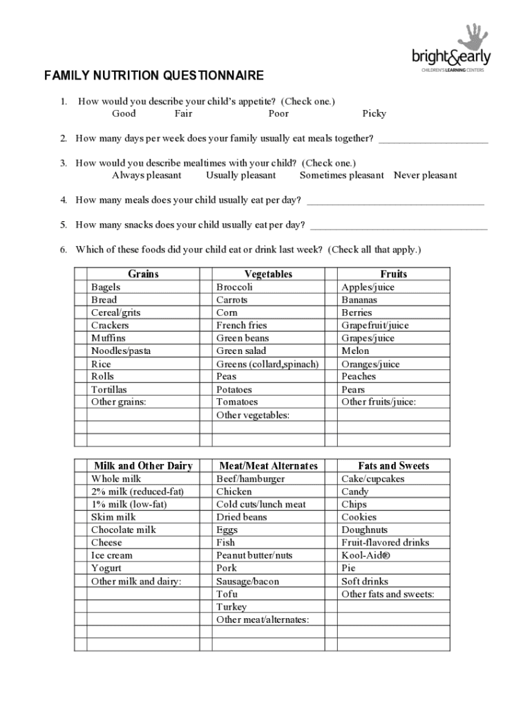FAMILY NUTRITION QUESTIONNAIRE 1. How would you describe your children appetite? (Check one.) Good Fair PoorPicky2. How many days per week does your family usually eat meals together? ___ 3. How would