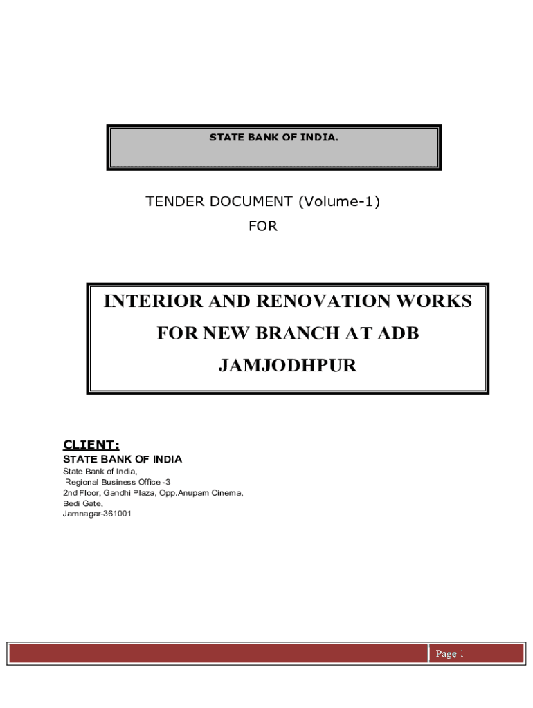 STATE BANK OF INDIA.TENDER DOCUMENT (Volume1) INTERIOR AND RENOVATION WORKS FOR NEW BRANCH AT ADB JAMJODHPURCLIENT: STATE BANK OF INDIA State Bank of India, Regional Business Office 3 2nd Floor, Gandhi