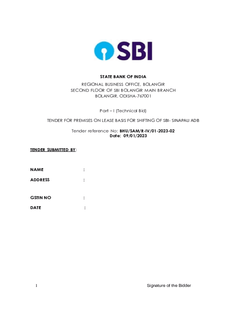 STATE BANK OF INDIA REGIONAL BUSINESS OFFICE, BOULANGER SECOND FLOOR OF SBI BOULANGER MAIN BRANCH BOULANGER, ODISHA767001 Part I (Technical Bid) TENDER FOR PREMISES ON LEASE BASIS FOR SHIFTING OF