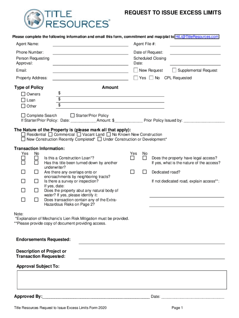 REQUEST TO ISSUE EXCESS LIMITSPlease complete the following information and email this form, commitment and map/plat to HiLi@TitleResources.com. Agent Name:Agent File #:Phone Number:Date of Request:Person