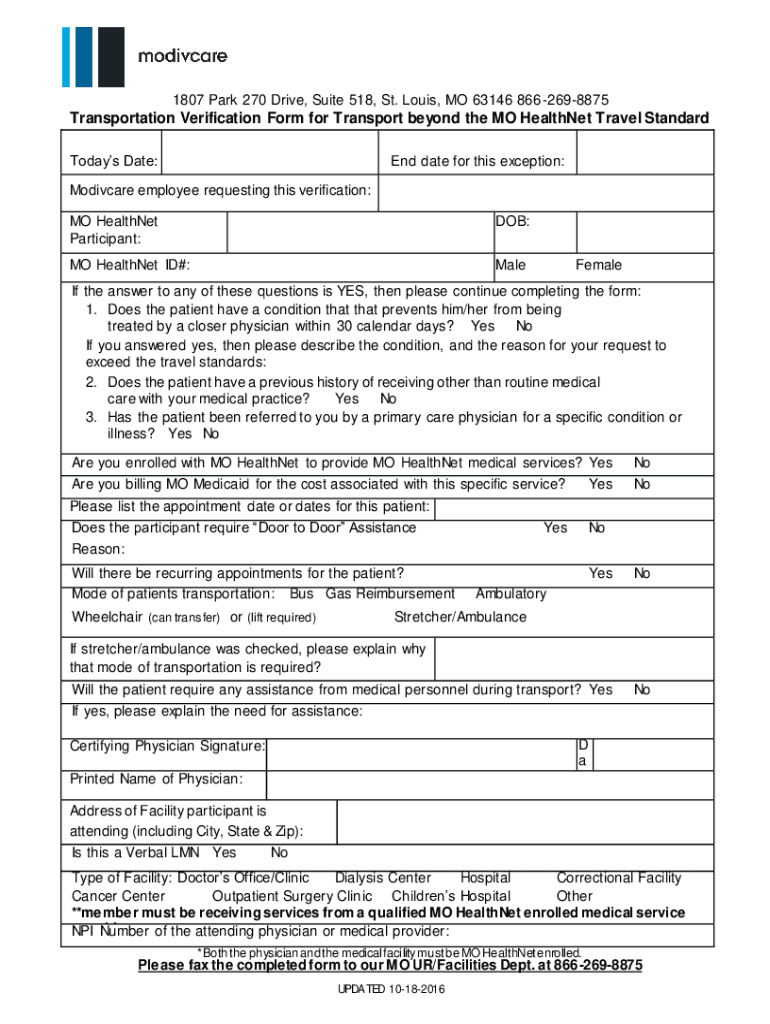 1807 Park 270 Drive, Suite 518, St. Louis, MO 63146 8662698875Transportation Verification Form for Transport beyond the MO Healthier Travel Standard