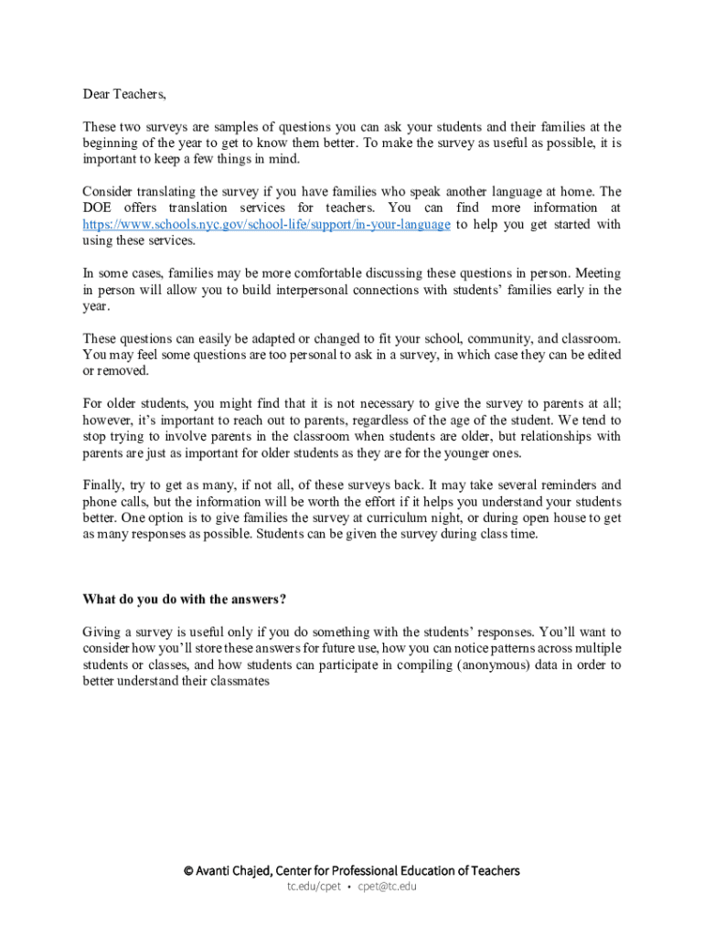 Dear Teachers, These two surveys are samples of questions you can ask your students and their families at the beginning of the year to get to know them better. To make the survey as useful as possible,