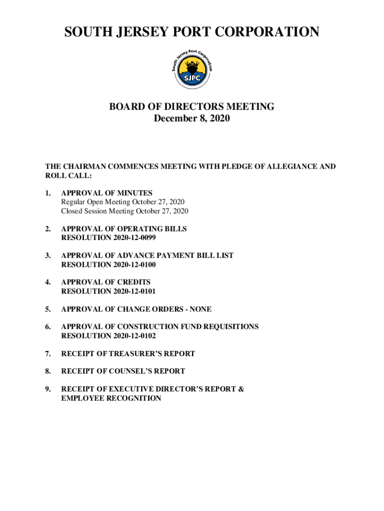 SOUTH JERSEY PORT CORPORATIONBOARD OF DIRECTORS MEETING December 8, 2020THE CHAIRMAN COMMENCES MEETING WITH PLEDGE OF ALLEGIANCE AND ROLL CALL: 1.APPROVAL OF MINUTES Regular Open Meeting October 27,
