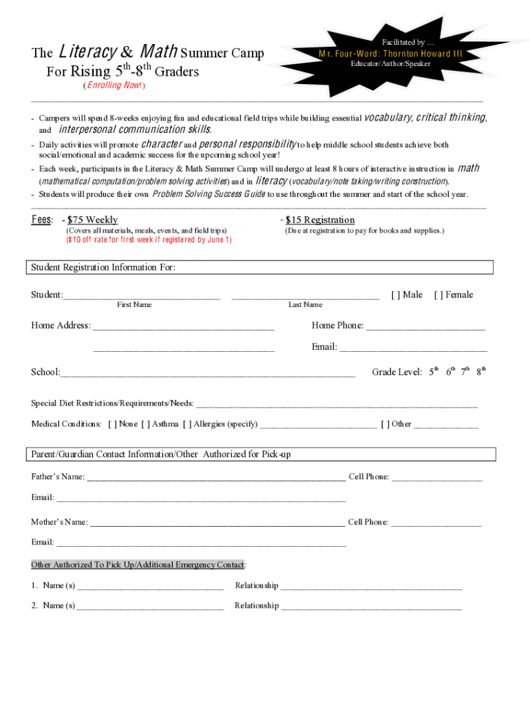 )DFLOLWDWHGEThe Literacy & Math Summer Camp TH For Rising 5 8 Graders r. Forward: Thornton Howard I I I Educator/Author/Speaker(En rolling Now!)___ Campers will spend 8weeks enjoying fun and educational