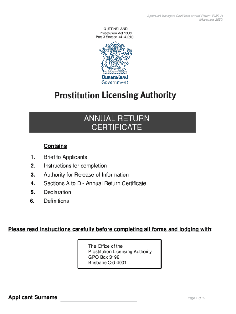 Approved Managers Certificate Annual Return, FM5V1 (November 2020)QUEENSLAND Prostitution Act 1999 Part 3 Section 44 (4)(d)(ii)ANNUAL RETURN CERTIFICATE Contains 1. Brief to Applicants2. Instructions