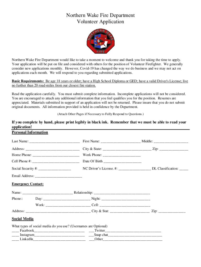 Northern Wake Fire Department Volunteer ApplicationNorthern Wake Fire Department would like to take a moment to welcome and thank you for taking the time to apply. Your application will be put on
