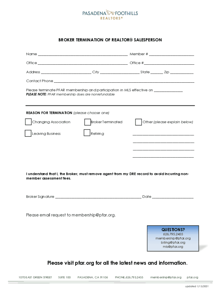BROKER TERMINATION OF REALTOR SALESPERSON Name ___ Member # ___ Office ___ Office #___ Address ___ City ___ State ___ Zip ___ Contact Phone ___ Please terminate FAR membership and participation in