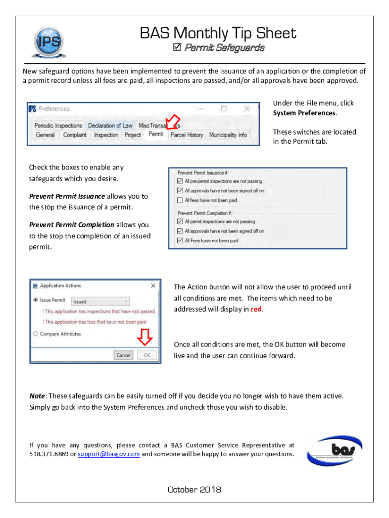 BAS Monthly Tip Sheet Permit Safeguards New safeguard options have been implemented to prevent the issuance of an application or the completion of a permit record unless all fees are paid, all inspections