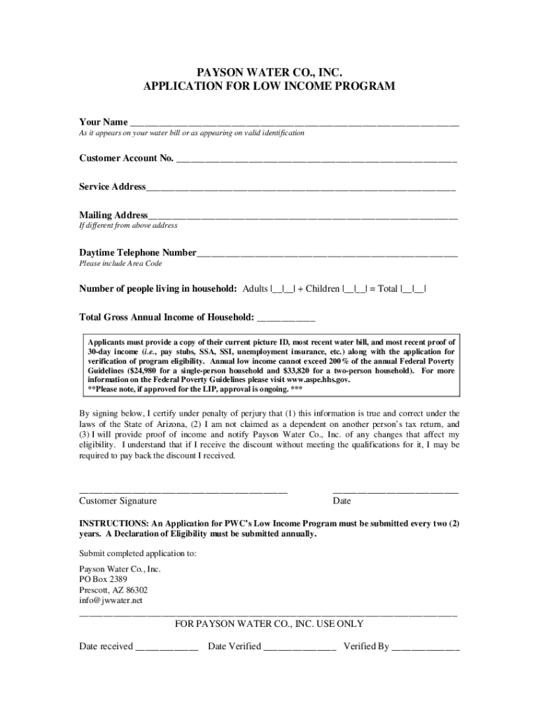 PAYSON WATER CO., INC. APPLICATION FOR LOW INCOME PROGRAM Your Name ___ As it appears on your water bill or as appearing on valid identificationCustomer Account No. ___ Service Address___ Mailing