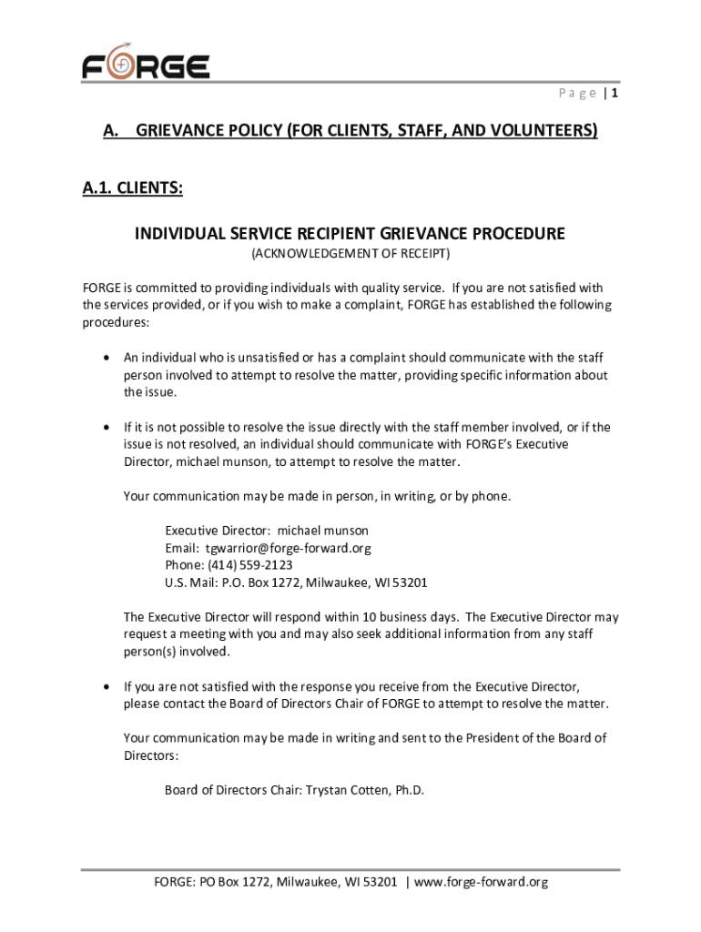 Page |1A. GRIEVANCE POLICY (FOR CLIENTS, STAFF, AND VOLUNTEERS) A.1. CLIENTS: INDIVIDUAL SERVICE RECIPIENT GRIEVANCE PROCEDURE (ACKNOWLEDGEMENT OF RECEIPT) FORGE is committed to providing individuals