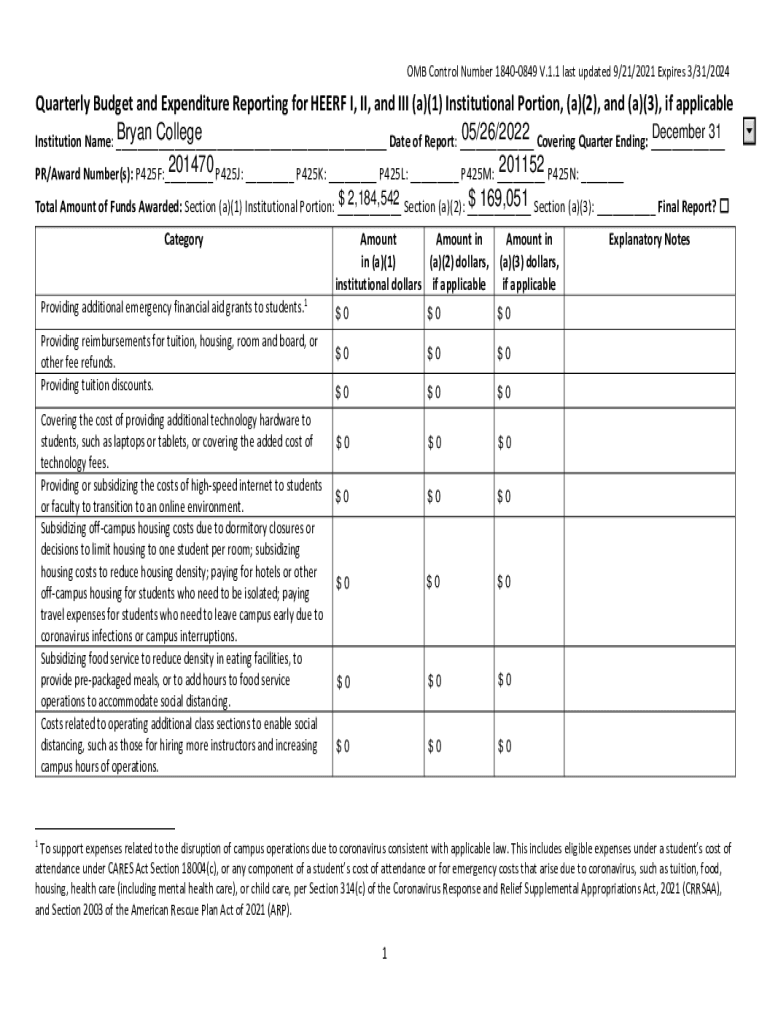 OMB Control Number 18400849 V.1.1 last updated 9/21/2021 Expires 3/31/2024QuarterlyBudgetandExpenditureReportingforHEERFI,II, Andrei(a)(1)Institutionalization, (a)(2), and(a)(3), inapplicable