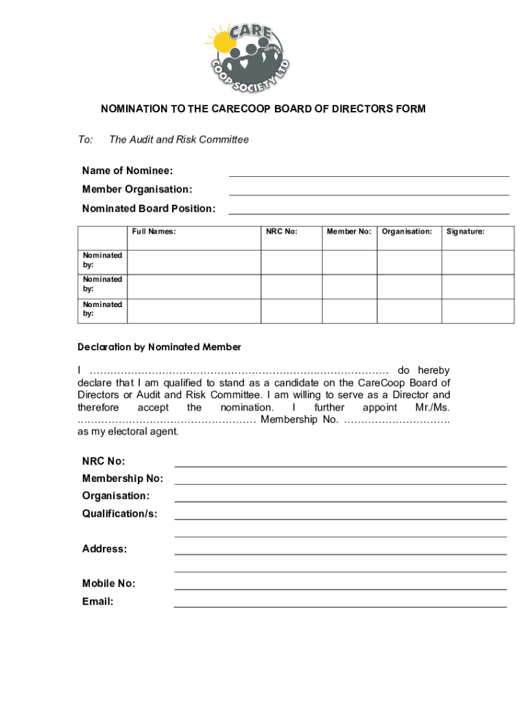 The nomination form to board typically requires information such as the candidate's name, contact information, experience, qualifications, and a statement of candidacy.