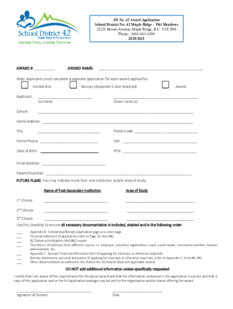 SD No. 42 Award Application School District No. 42 Maple Ridge Pitt Meadows 22225 Brown Avenue, Maple Ridge, B.C. V2X 8N6 Phone: (604) 4634200 2020/2021AWARD #: ___AWARD NAME:___Note: Applicants must