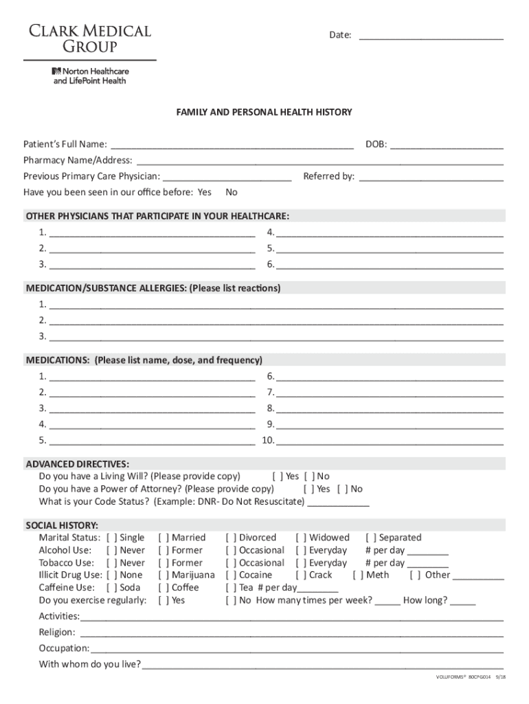 Date: ___FAMILY AND PERSONAL HEALTH HISTORY Patients Full Name: ___DOB:___ Pharmacy Name/Address:___ Previous Primary Care Physician:___Referred by:___ Have you been seen in our office before: Yes