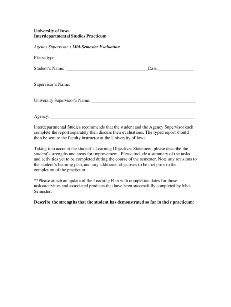 University of Iowa Interdepartmental Studies Practicum Agency Supervisors Semester Evaluation Please type Students Name: ___Date:___Supervisors Name: ___University Supervisors Name: ___Agency: ___
