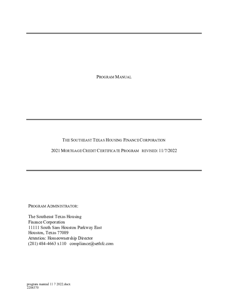 PROGRAM MANUAL SOUTHEAST TEXAS HOUSING FINANCE CORPORATION