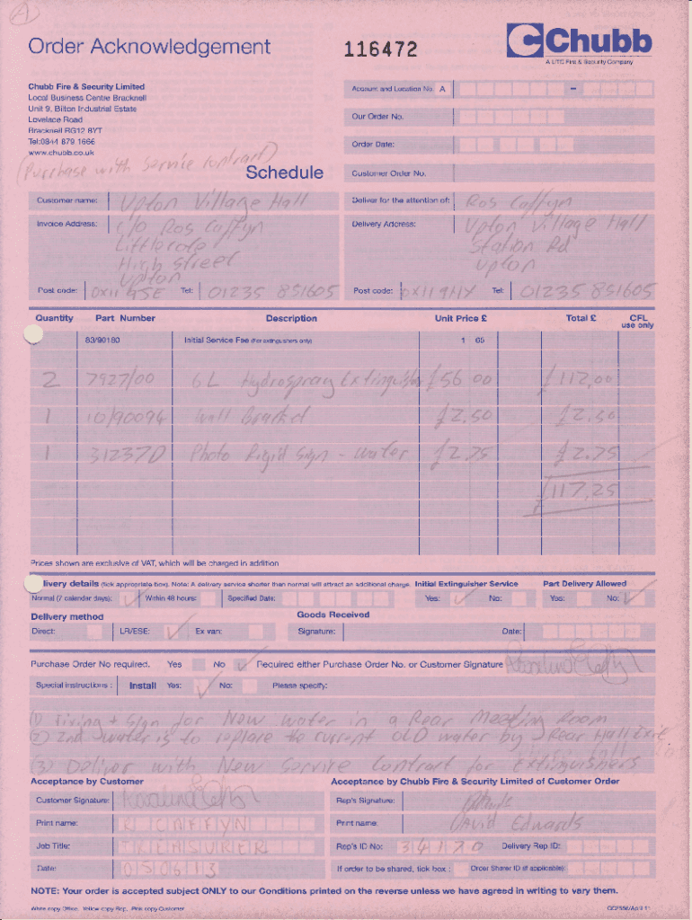 Order Acknowledgement(3Chubb116472Chubb Fire & Security Limited DA UTC Are & Security CompanyAccount and Location No. Local Bus1ness Center Bracknell Unit 9, Bolton Industrial Estate Our Order No.