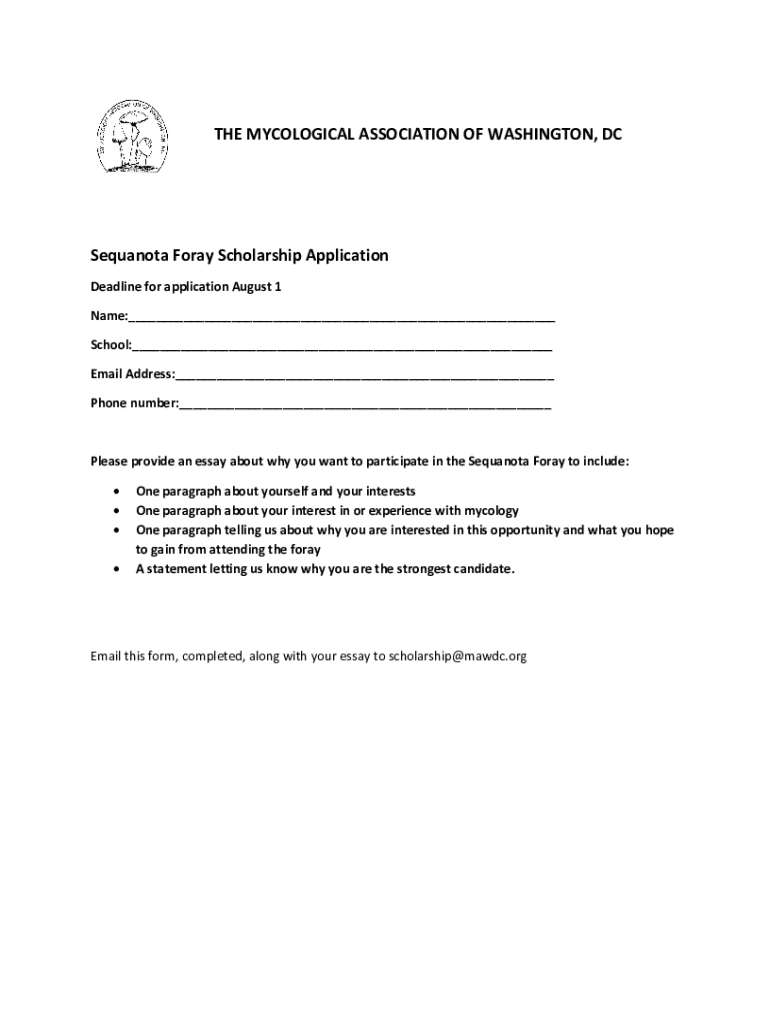 THE ECOLOGICAL ASSOCIATION OF WASHINGTON, DCSequanota Foray Scholarship Application Deadline for application August 1 Name:___ School:___ Email Address:___ Phone number:___Please provide an essay
