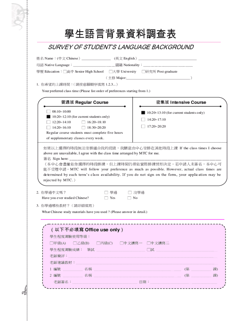 SURVEY OF STUDENTS LANGUAGE BACKGROUND Name(Chinese___ (English___ Native Language___ Nationality___ Education Senior High School University Postgraduate Major:___ 1. 1.2.3... Your preferred class