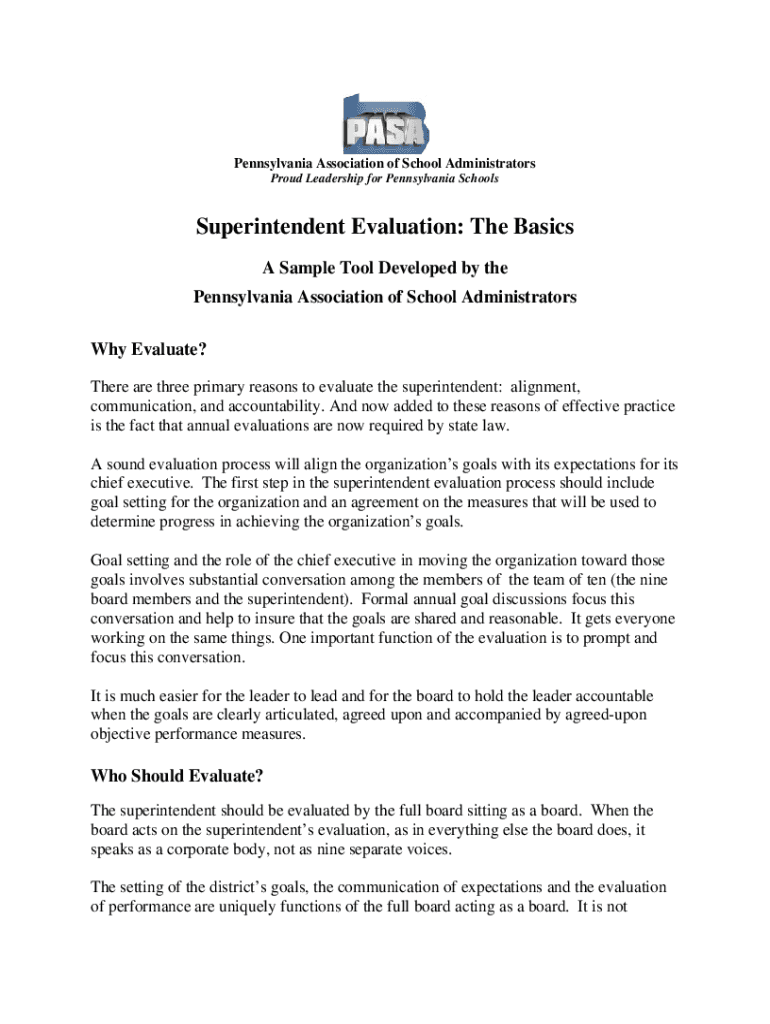 Pennsylvania Association of School Administrators Proud Leadership for Pennsylvania SchoolsSuperintendent Evaluation: The Basics A Sample Tool Developed by the Pennsylvania Association of School Administrators