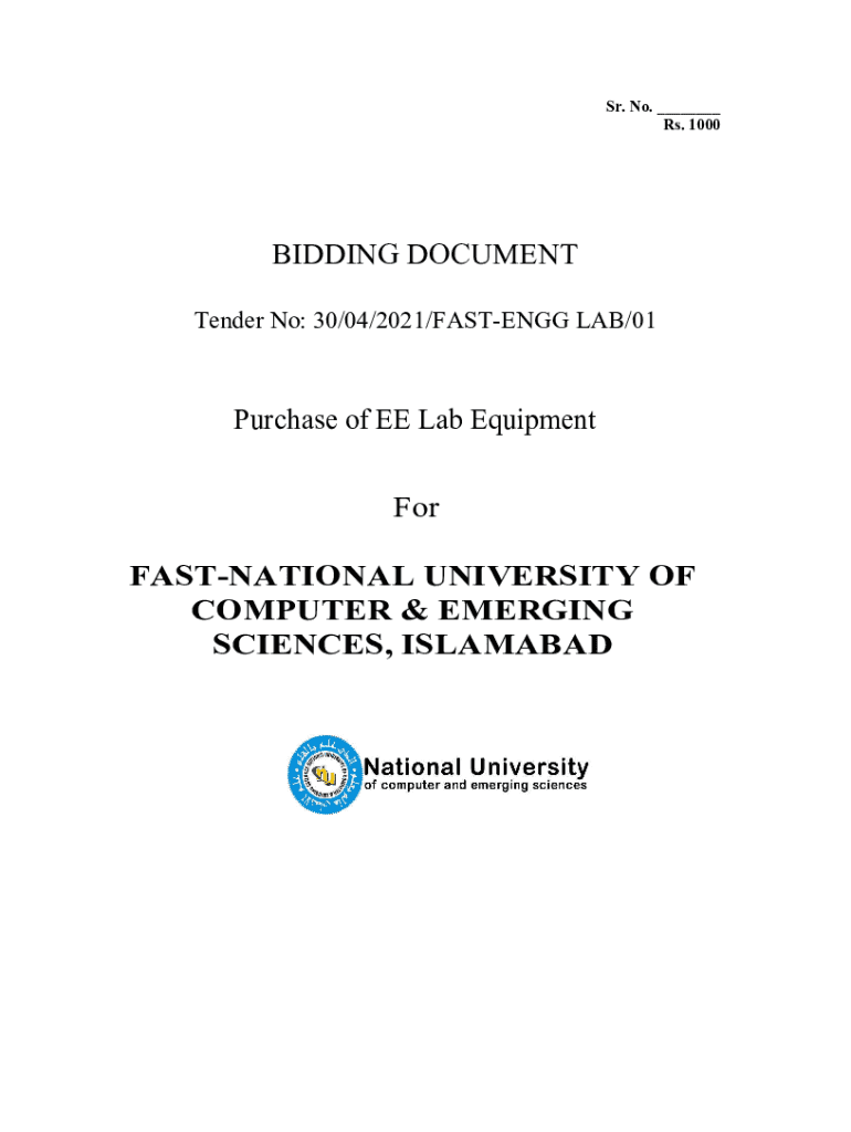 Sr. No. ___ Rs. 1000BIDDING DOCUMENT Tender No: 30/04/2021/FASTEN GG LAB/01Purchase of EE Lab Equipment For GESTATIONAL UNIVERSITY OF COMPUTER & EMERGING SCIENCES, ISLAMABADTENDER NOTICE GESTATIONAL