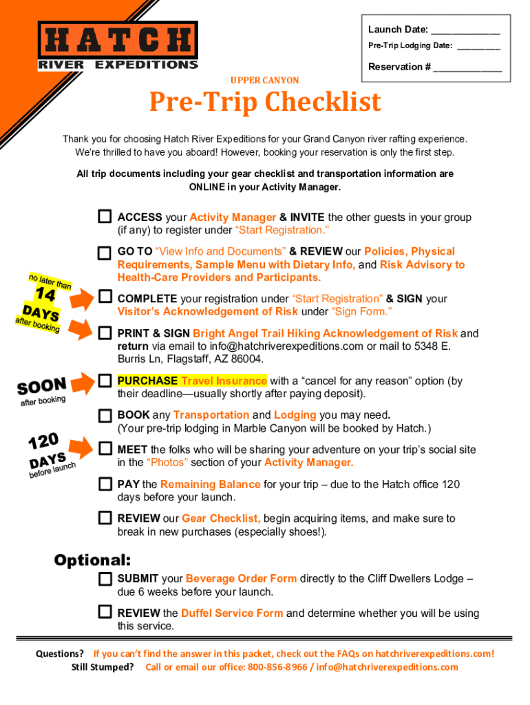 Launch Date: ___ Pretoria Lodging Date: ___UPPER CANYONReservation # ___Pretoria Checklist Thank you for choosing Hatch River Expeditions for your Grand Canyon river rafting experience. Were thrilled