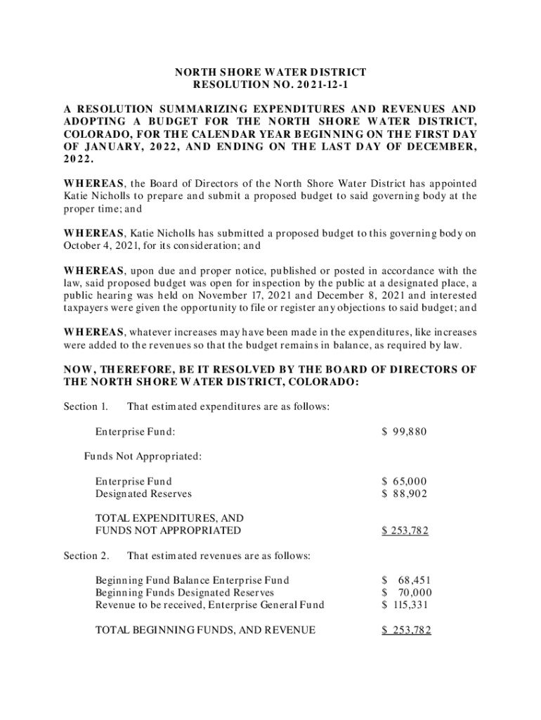 NORTH SHORE WATER DISTRICT RESOLUTION NO. 2021121 A RESOLUTION SUMMARIZING EXPENDITURES AND REVENUES AND ADOPTING A BUDGET FOR THE NORTH SHORE WATER DISTRICT, COLORADO, FOR THE CALENDAR YEAR BEGINNING