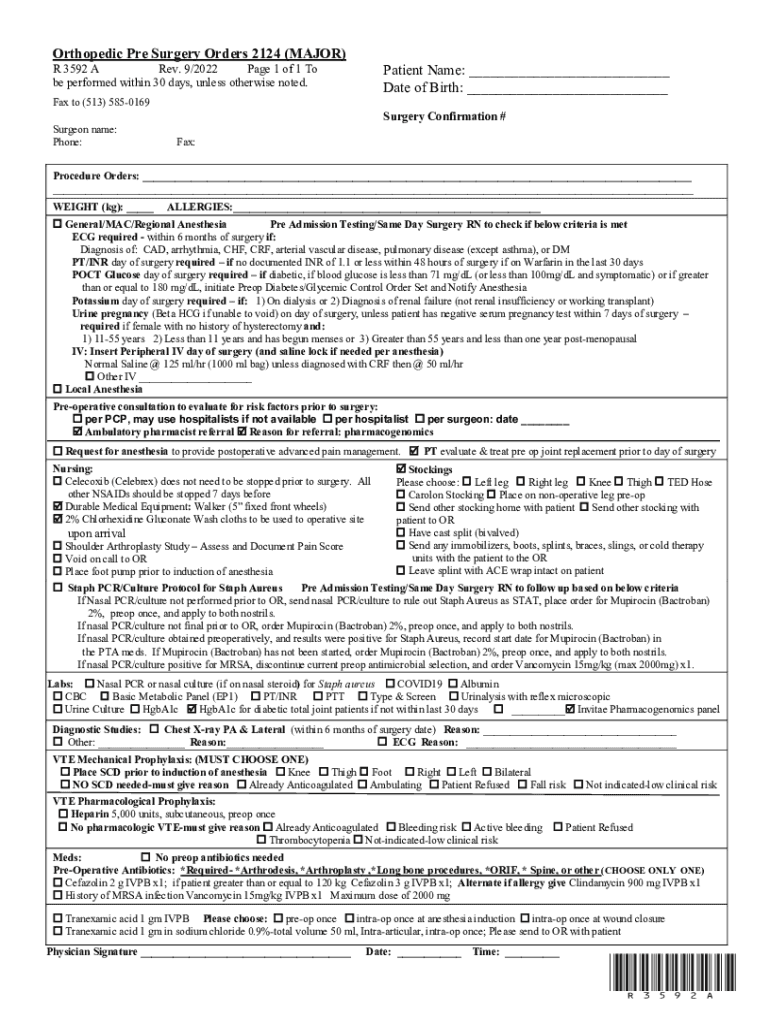 Orthopedic PRE Surgery Orders 2124 (MAJOR)Patient Name: ___ Date of Birth: ___R 3592 A Rev. 9/2022-Page 1 of 1 To be performed within 30 days, unless otherwise noted. Fax to (513) 5850169Surgeon name:
