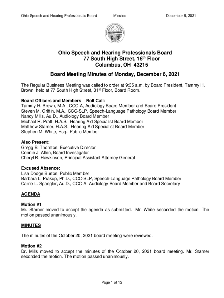 Ohio Speech and Hearing Professionals BoardMinutesDecember 6, 2021Ohio Speech and Hearing Professionals Board 77 South High Street, 16th Floor Columbus, OH 43215 Board Meeting Minutes of Monday, December